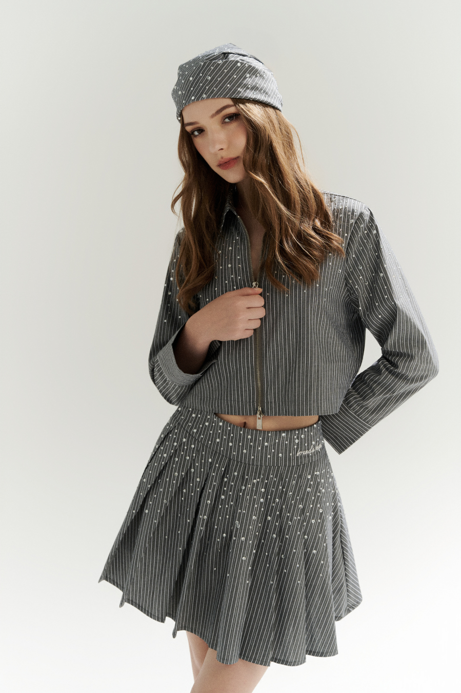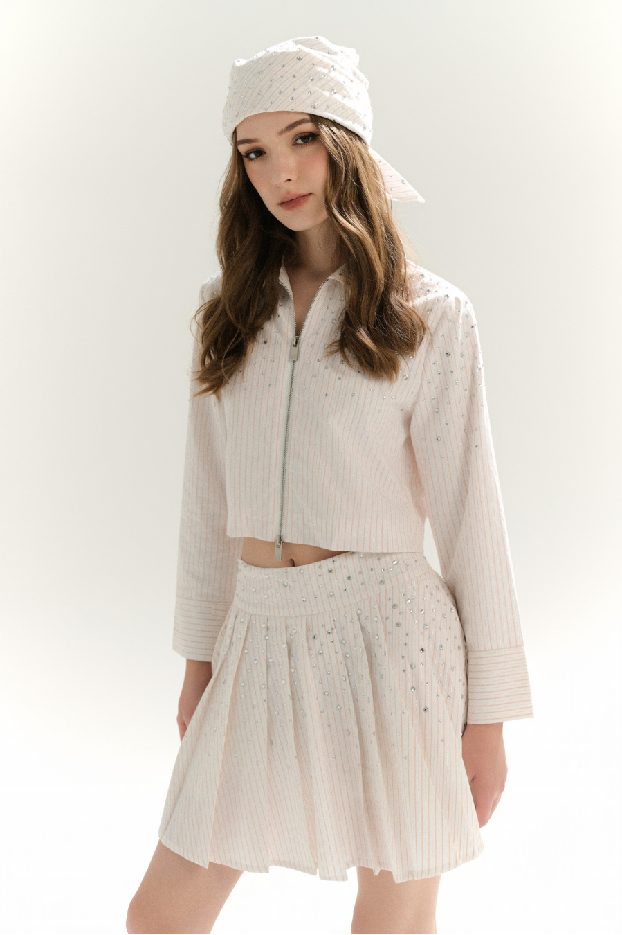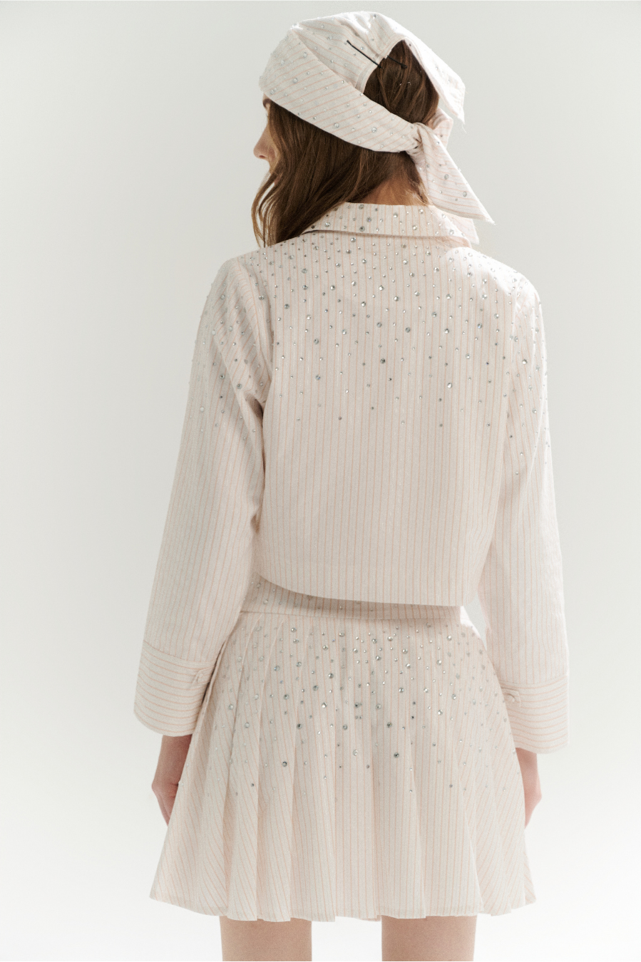 This preppy, lightweight set is ideal for warm climates. The top functions as a versatile “shacket” (shirt/ jacket) that can be worn buttoned up as a shirt or styled as outerwear. Dual zippers offer stylish flexibility, while the BK logo zipper pull adds a distinct branded touch. Gemstones arranged in a raindrop ombré pattern elevate both the top and bottom. As always, the skirt is a skort with pockets, offering practicality without sacrificing style. The pieces mix and match easily, and the scarf can be worn as a headpiece or even styled as a makeshift top.