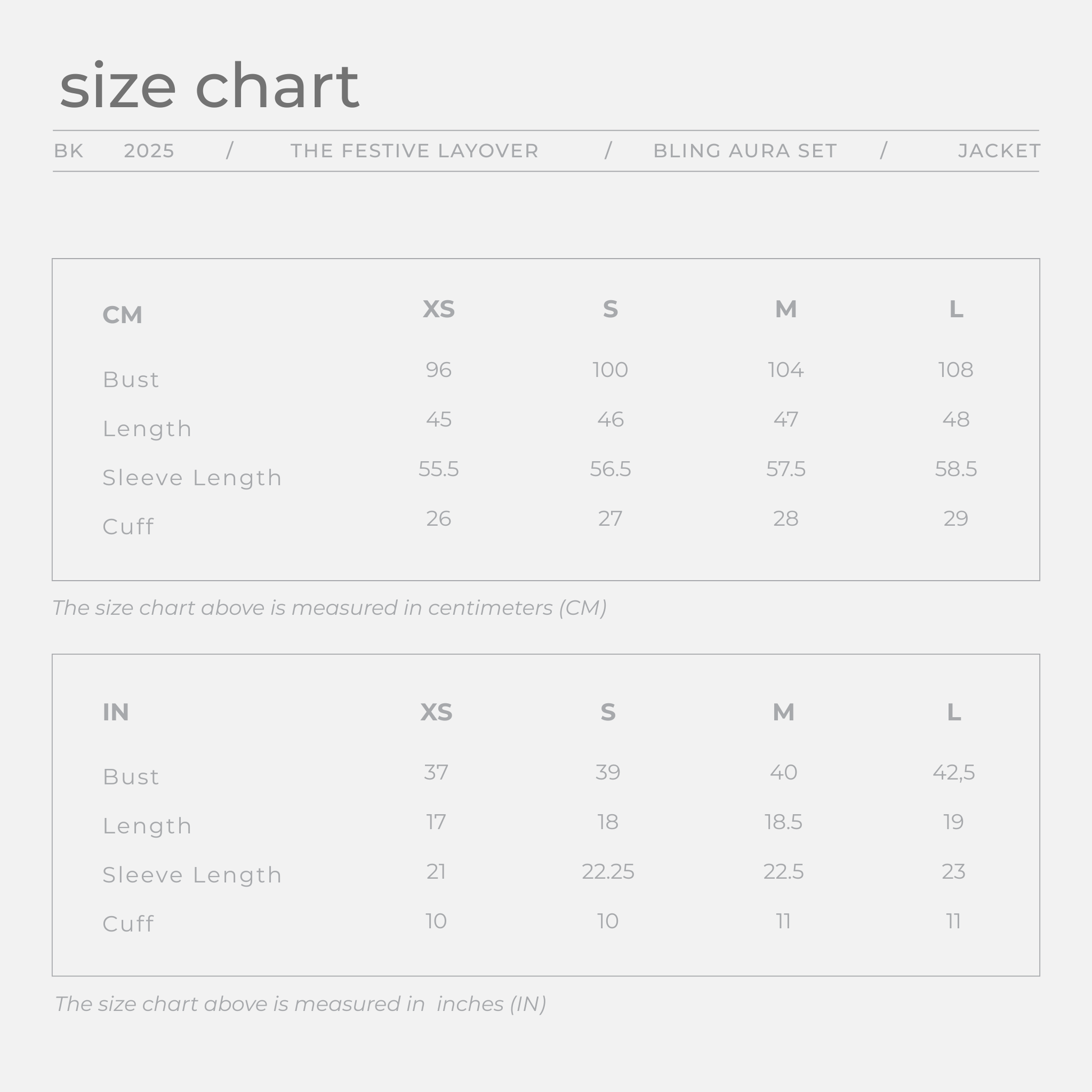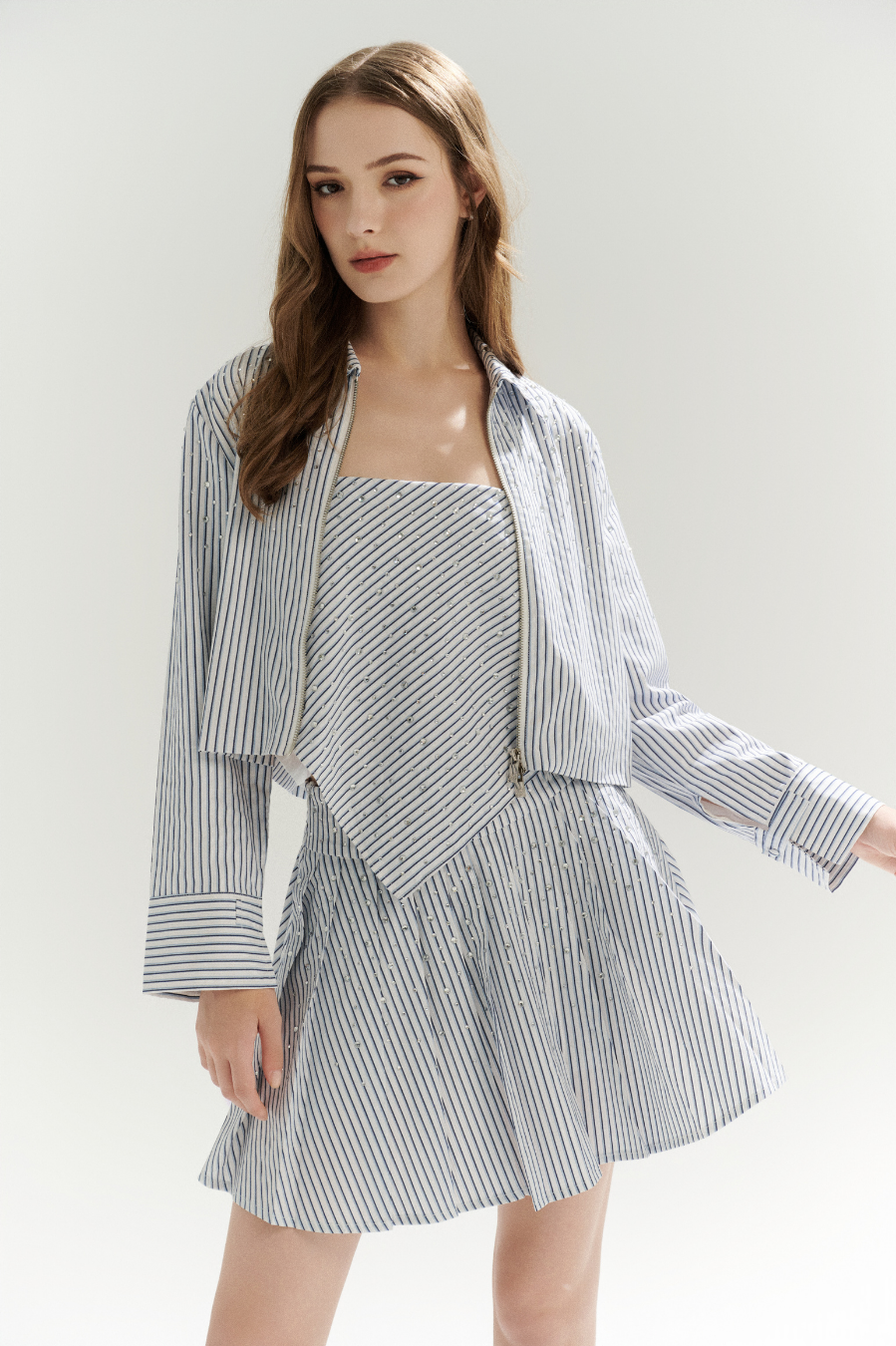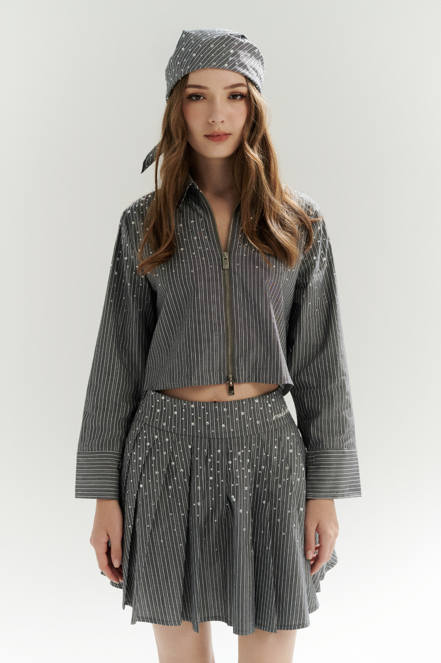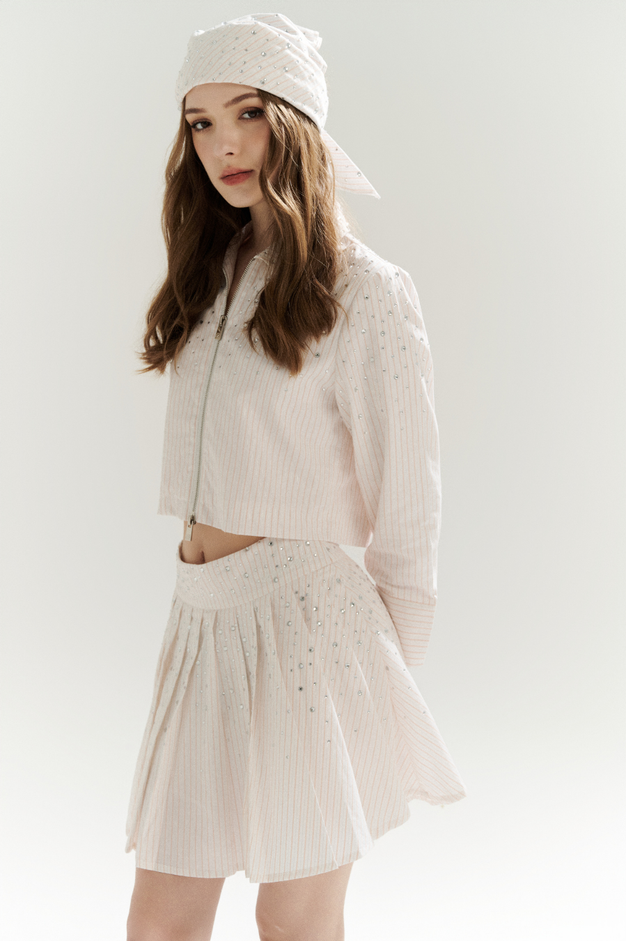 This preppy, lightweight set is ideal for warm climates. The top functions as a versatile “shacket” (shirt/ jacket) that can be worn buttoned up as a shirt or styled as outerwear. Dual zippers offer stylish flexibility, while the BK logo zipper pull adds a distinct branded touch. Gemstones arranged in a raindrop ombré pattern elevate both the top and bottom. As always, the skirt is a skort with pockets, offering practicality without sacrificing style. The pieces mix and match easily, and the scarf can be worn as a headpiece or even styled as a makeshift top.