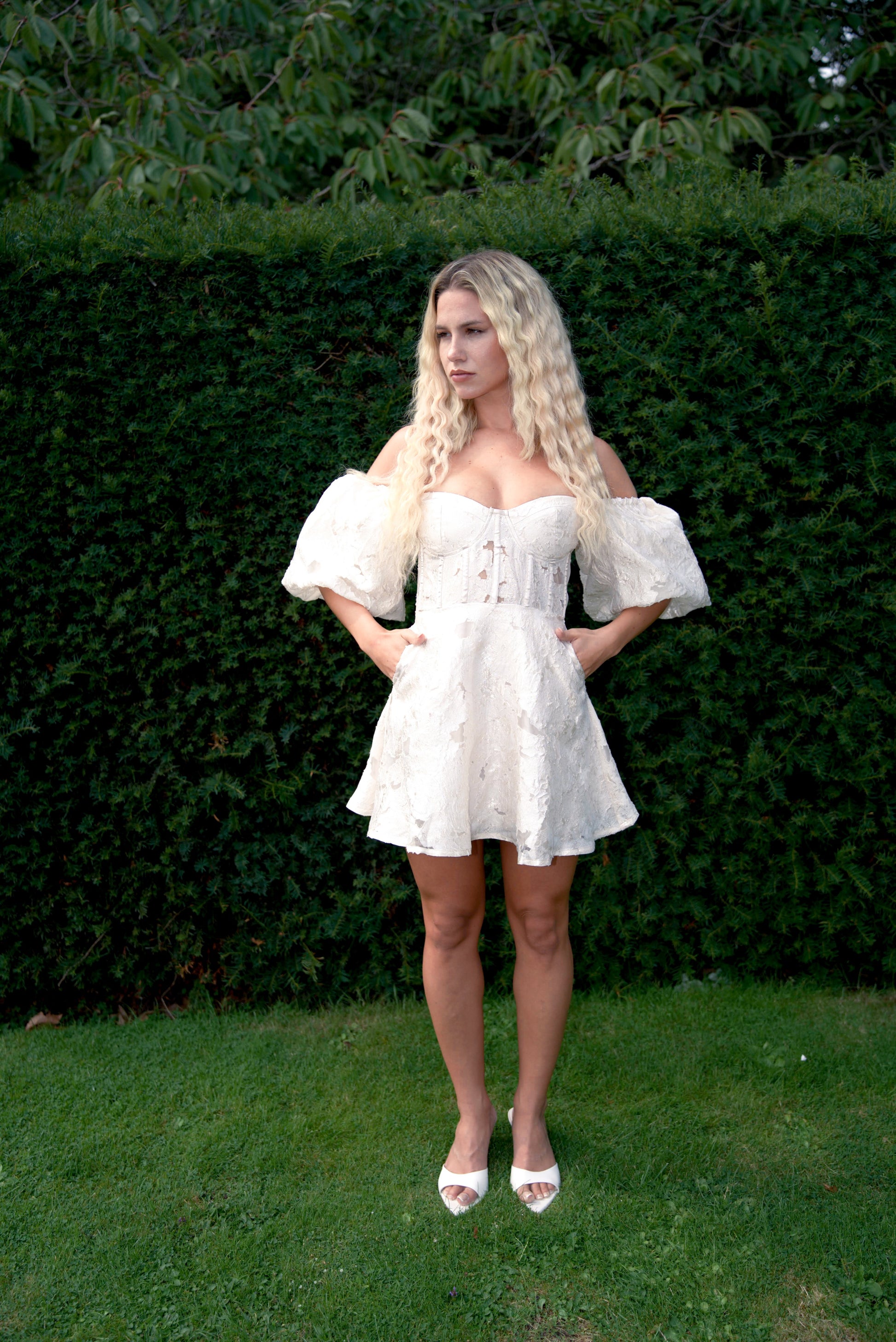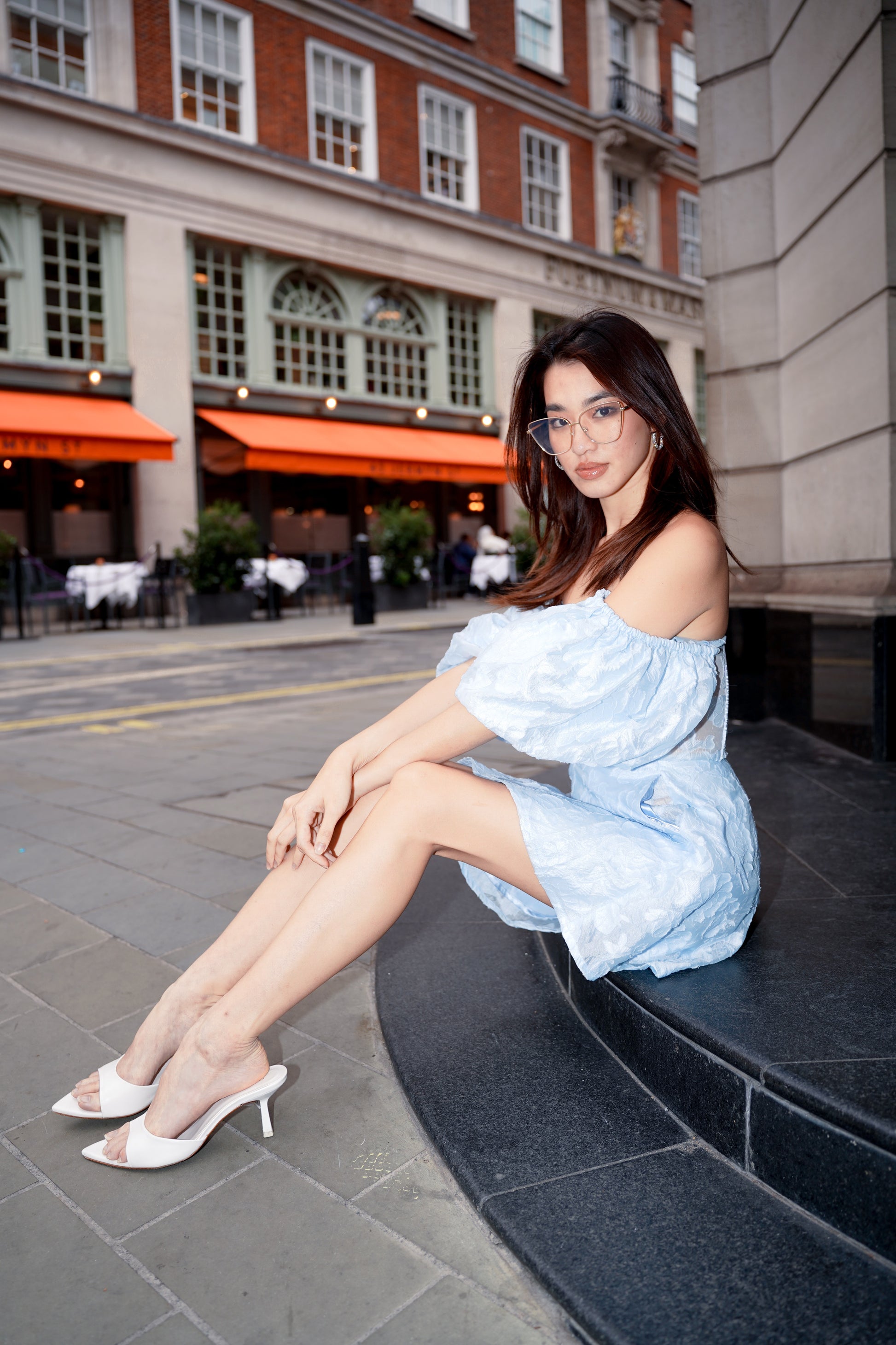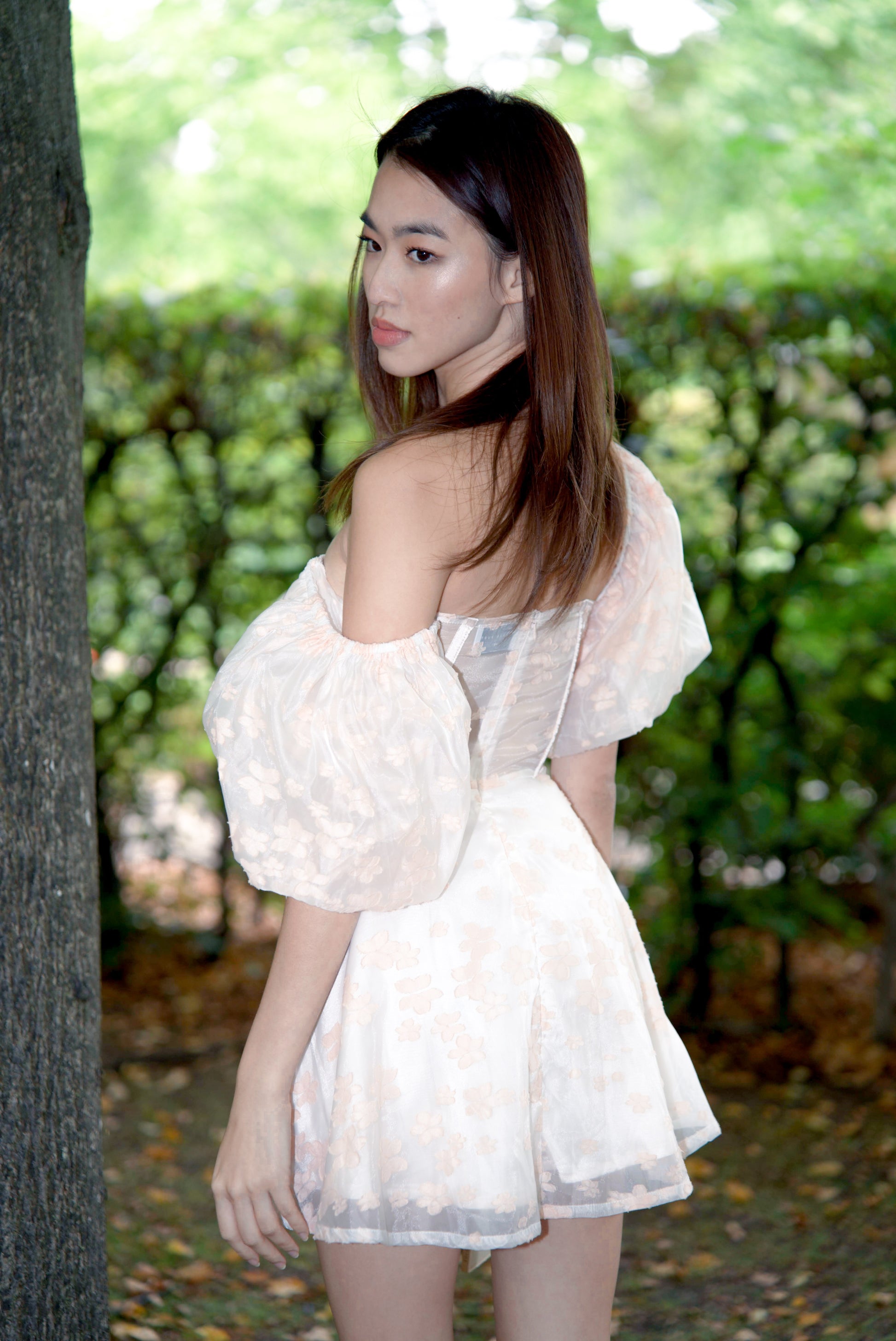 The puffy sleeves, which can be styled off the shoulder, add a touch of romantic allure to your look. The dress draws its name and inspiration from the designer's recent sojourn in Nice, France, a place known for its warm hospitality and romantic ambiance.