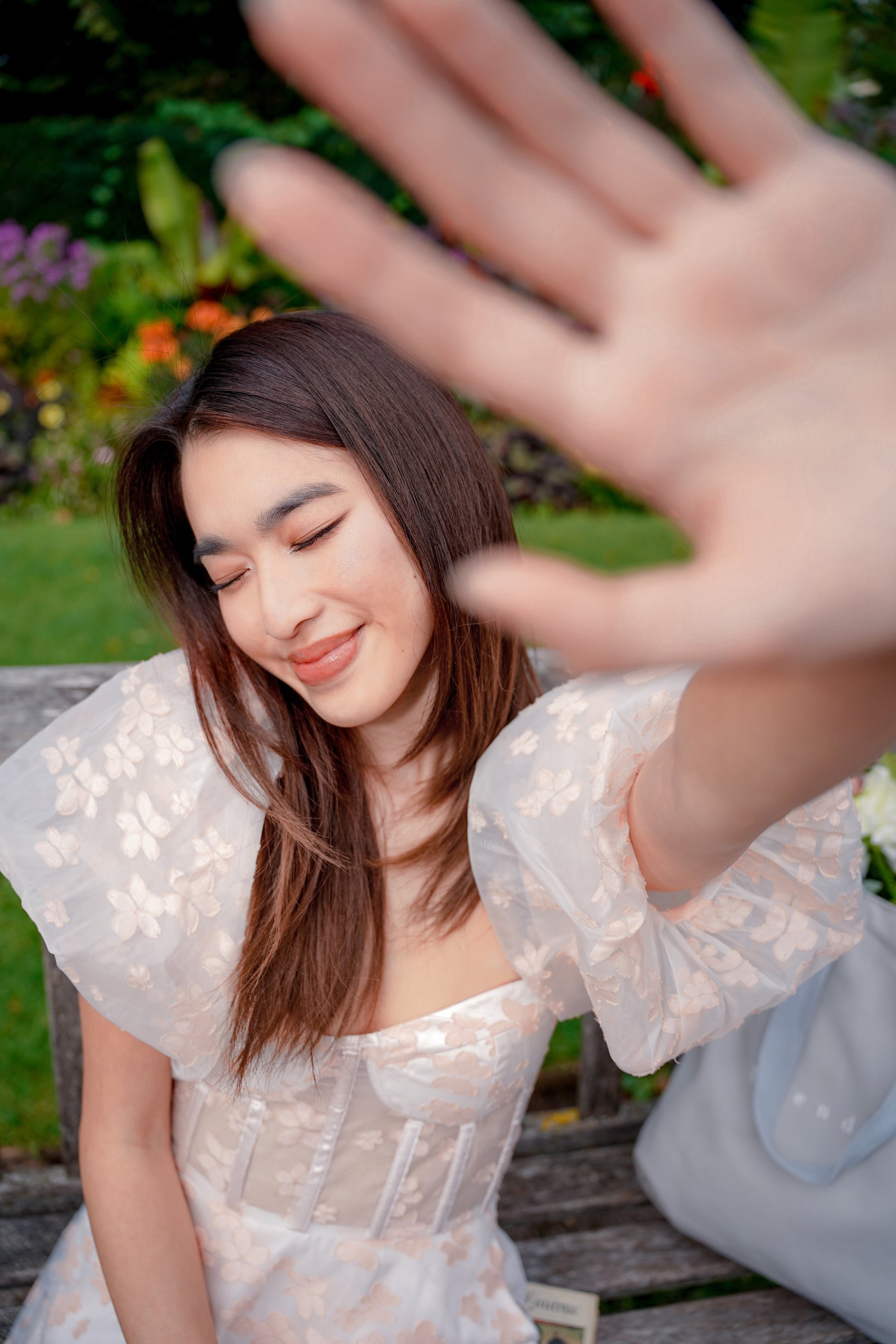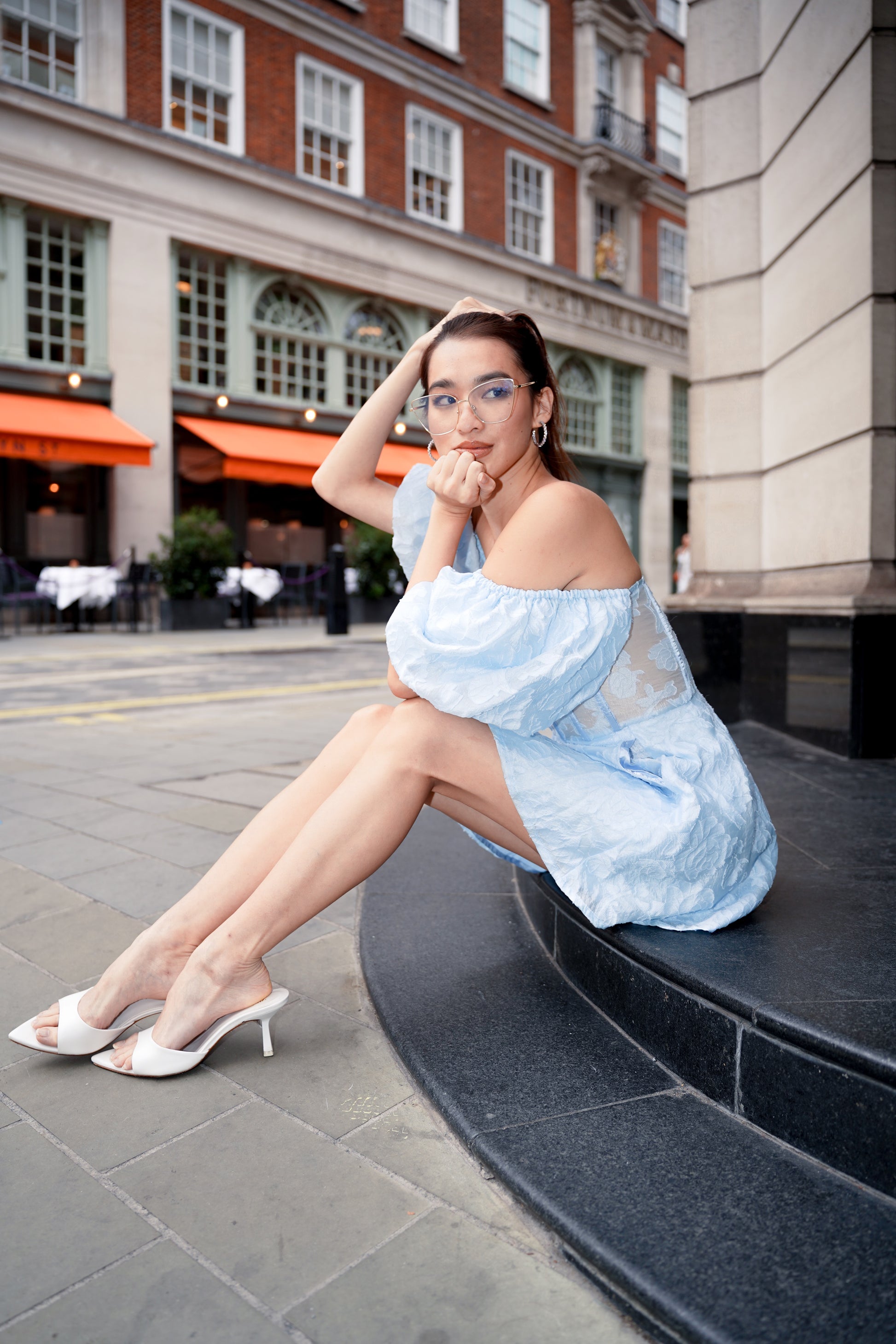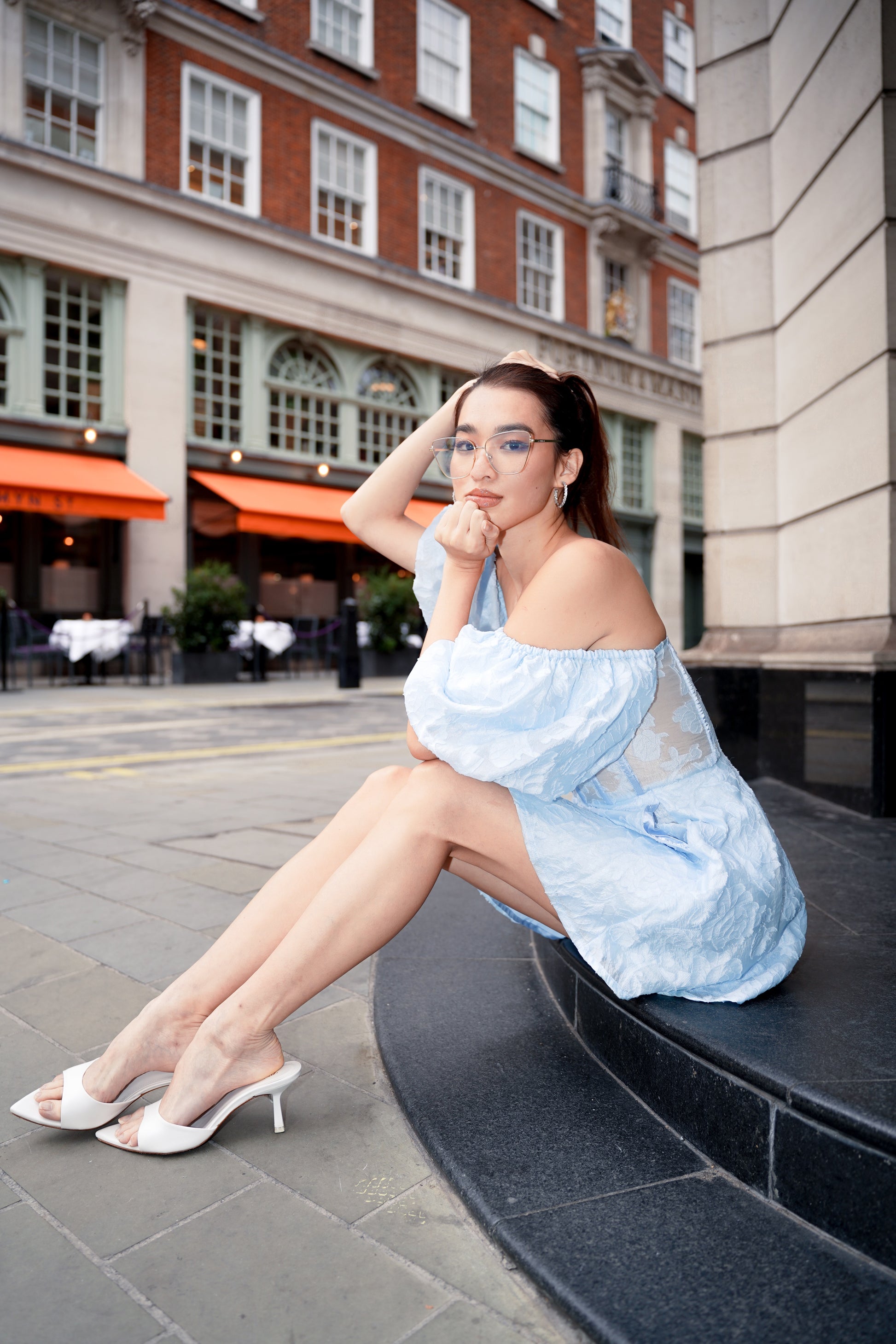 The puffy sleeves, which can be styled off the shoulder, add a touch of romantic allure to your look. The dress draws its name and inspiration from the designer's recent sojourn in Nice, France, a place known for its warm hospitality and romantic ambiance.