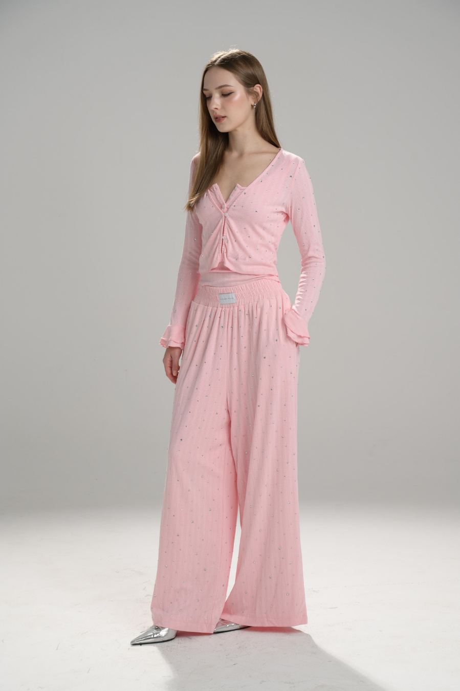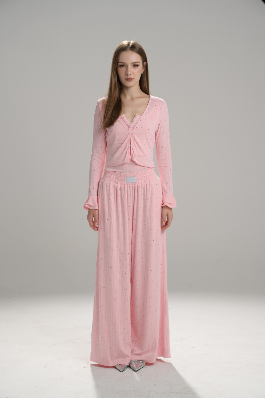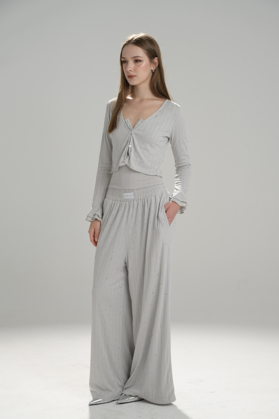 The Soft Bling Lounge Set combines cozy comfort with subtle, refined sparkle for an elevated everyday look. Crafted from soft, breathable fabric with a gentle shimmer, the set includes a soft cardigan, a fitted singlet, and coordinating bottoms that move effortlessly with you. The cardigan drapes elegantly over the shoulders, while the singlet provides a sleek, comfortable layer, and the bottoms offer a flattering, relaxed fit together creating a complete loungewear ensemble with quiet sophistication.