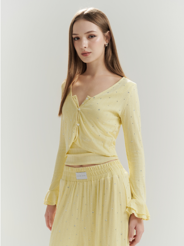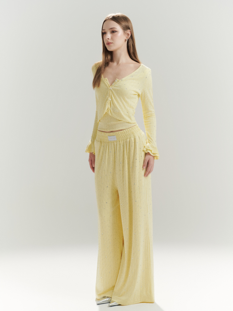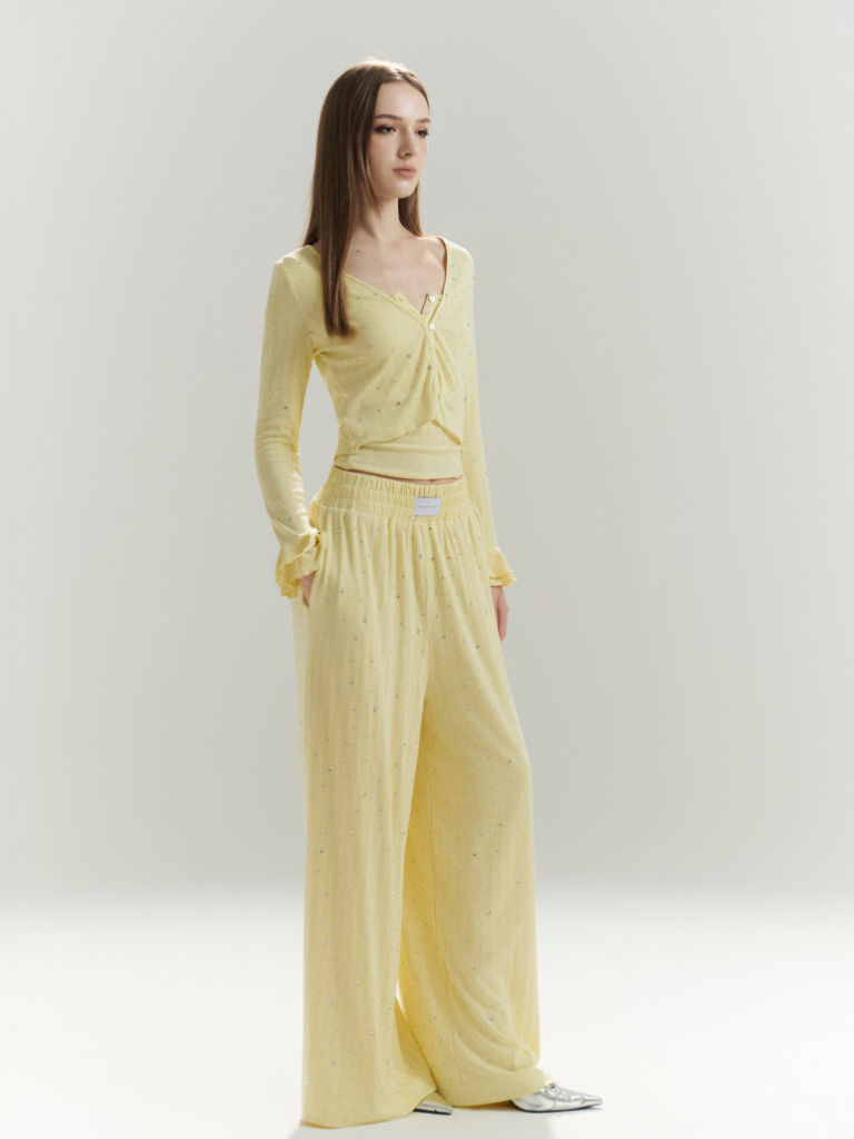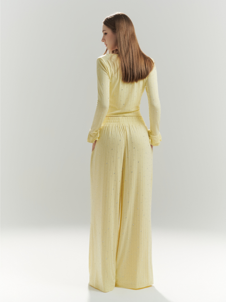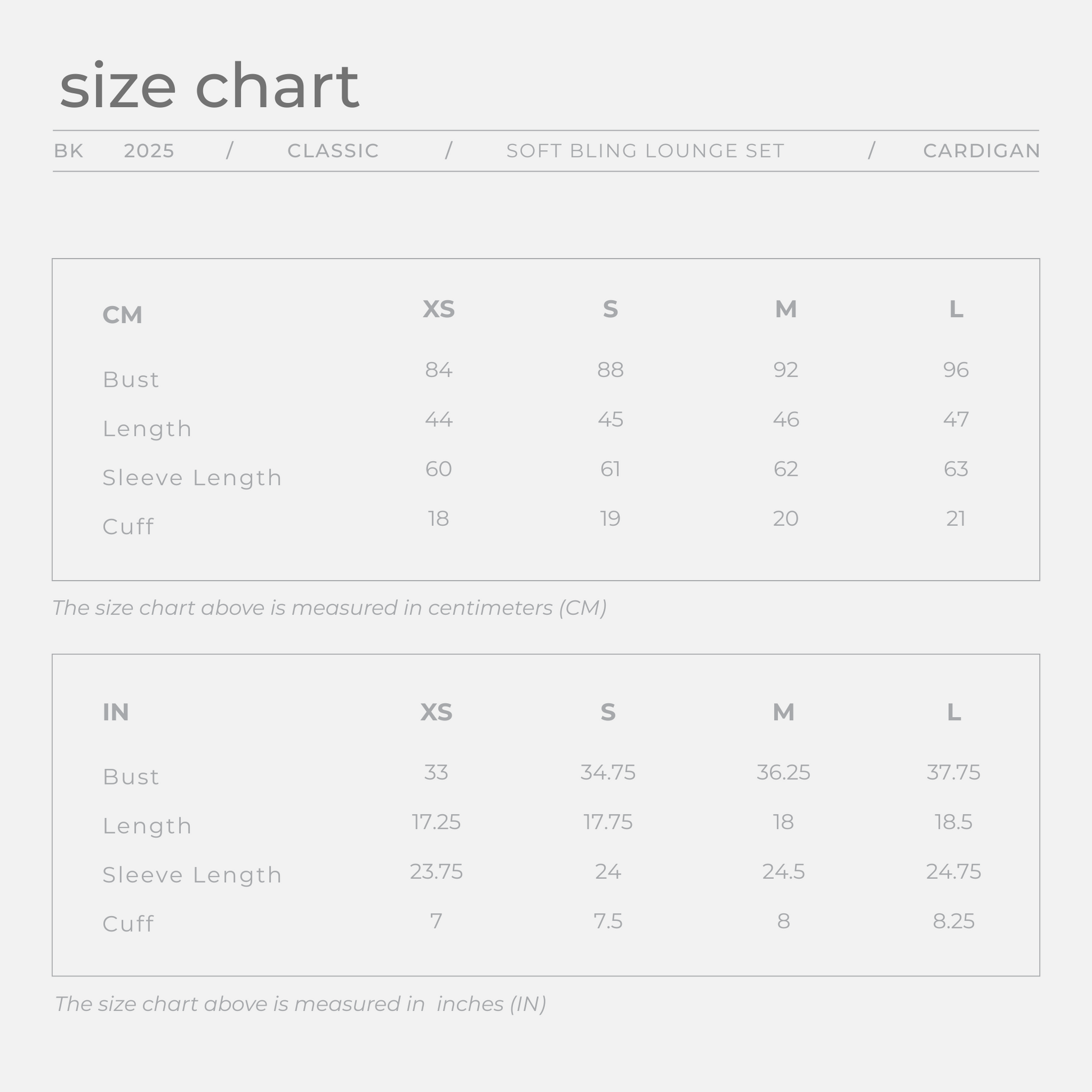 The Soft Bling Lounge Set combines cozy comfort with subtle, refined sparkle for an elevated everyday look. Crafted from soft, breathable fabric with a gentle shimmer, the set includes a soft cardigan, a fitted singlet, and coordinating bottoms that move effortlessly with you. The cardigan drapes elegantly over the shoulders, while the singlet provides a sleek, comfortable layer, and the bottoms offer a flattering, relaxed fit together creating a complete loungewear ensemble with quiet sophistication.